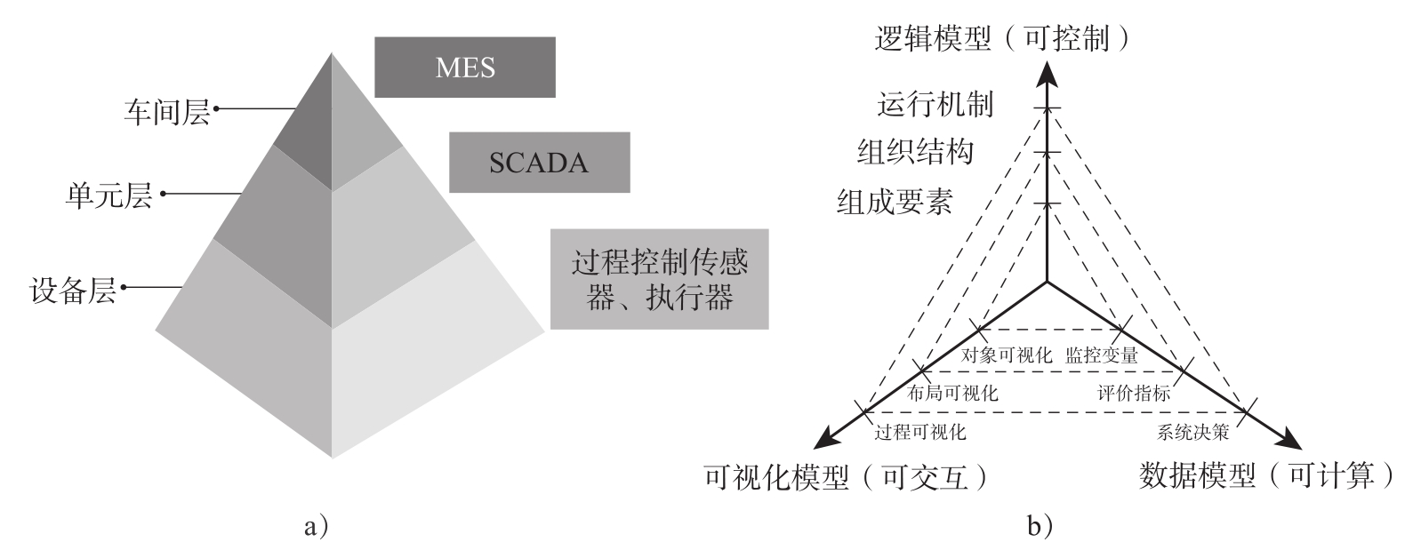 图3-11描述了物理车间和虚拟车间模型。如图3-11a所示,生产车间是一个典型的层次结构,同时包括物理硬件(如过程控制传感器、执行器)和信息管理软件(SCADA、MES等)。如图3-11b所示,从轴向看,从CPS的可交互、可控制、可计算三个要求出发,三个轴分别从可视化模型、逻辑模型和数据模型三个维度来刻画物理车间;从周向看,三个不同维度又从三个层次实现了对生产车间各尺度的映射,如从对象可视化、组成要素、监控变量三个维度刻画了设备层,从布局可视化、组织结构、评价指标刻画了单元/产线层(子系统),从过程可视化、运行机制、系统决策刻画了车间层(复杂系统)。