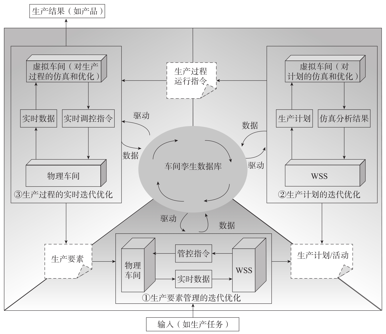 通过以上三个阶段,车间完成生产任务并得到生产结果(如产品),生产要素相关信息存入WSS中,开始下一轮生产任务。通过阶段①、②、③的迭代优化,车间孪生数据被不断更新与扩充,DTW也得到不断的进化和完善。