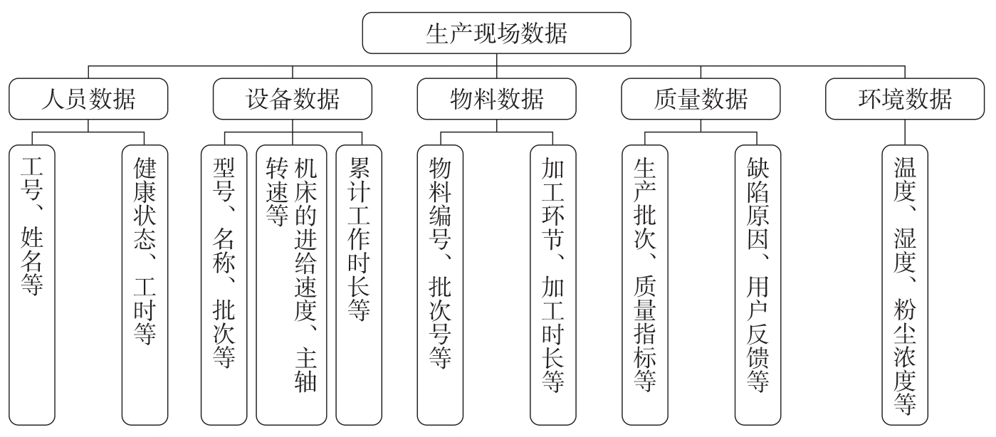 4)质量数据。加工过程中的质量数据包括生产批次、质量指标、缺陷原因、用户反馈等,为产品质量追溯、缺陷因素分析优化提供重要支撑。质量数据的获取主要依赖于机器检测和人工检测。机器检测数据,可以直接通过通信接口上传,而人工检测数据需要工人通过工业便携式设备或者计算机录入后上传。