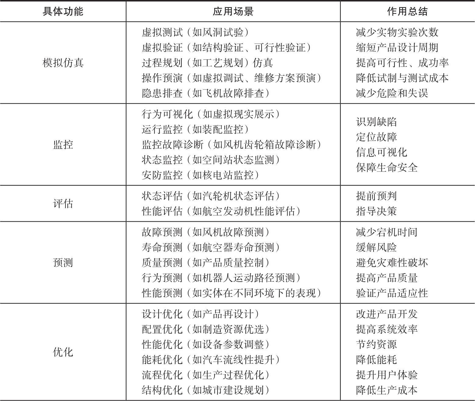 表1-9 数字孪生的具体功能、应用场景及作用总结 [31]