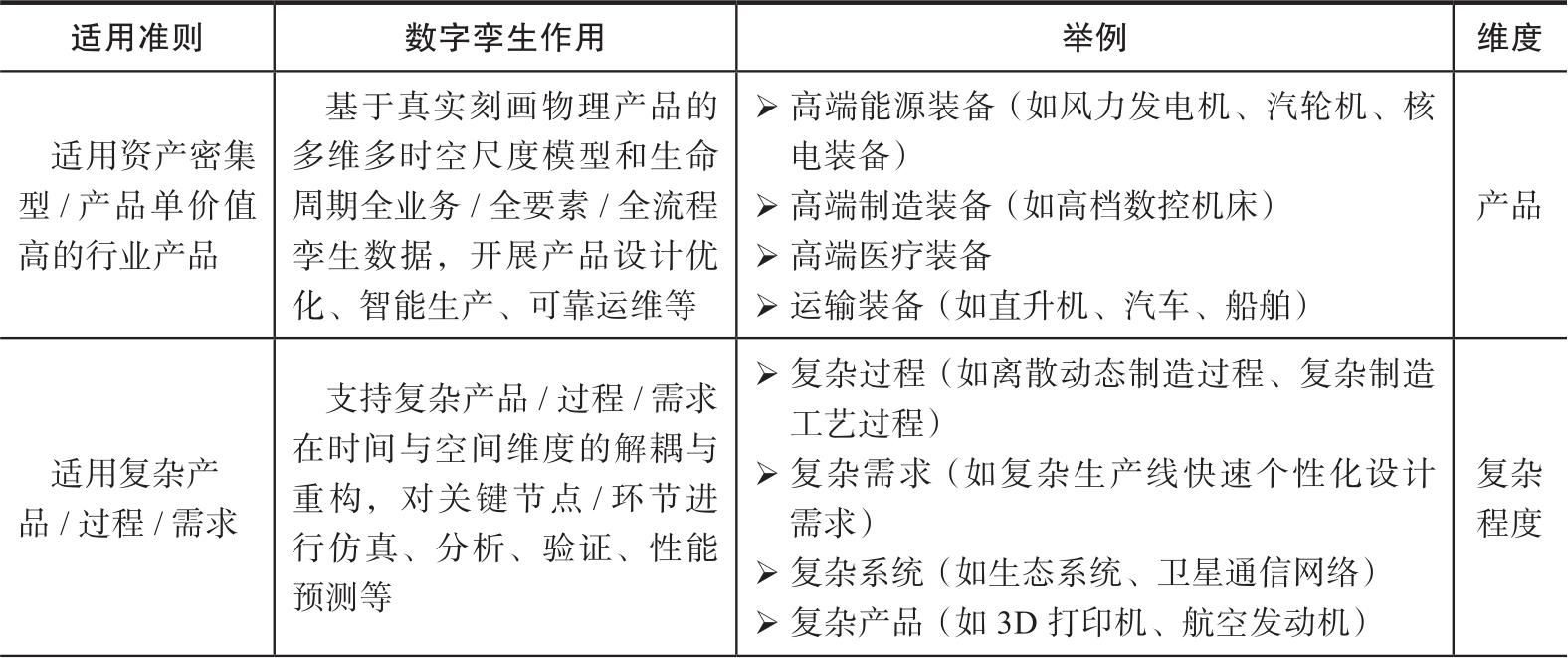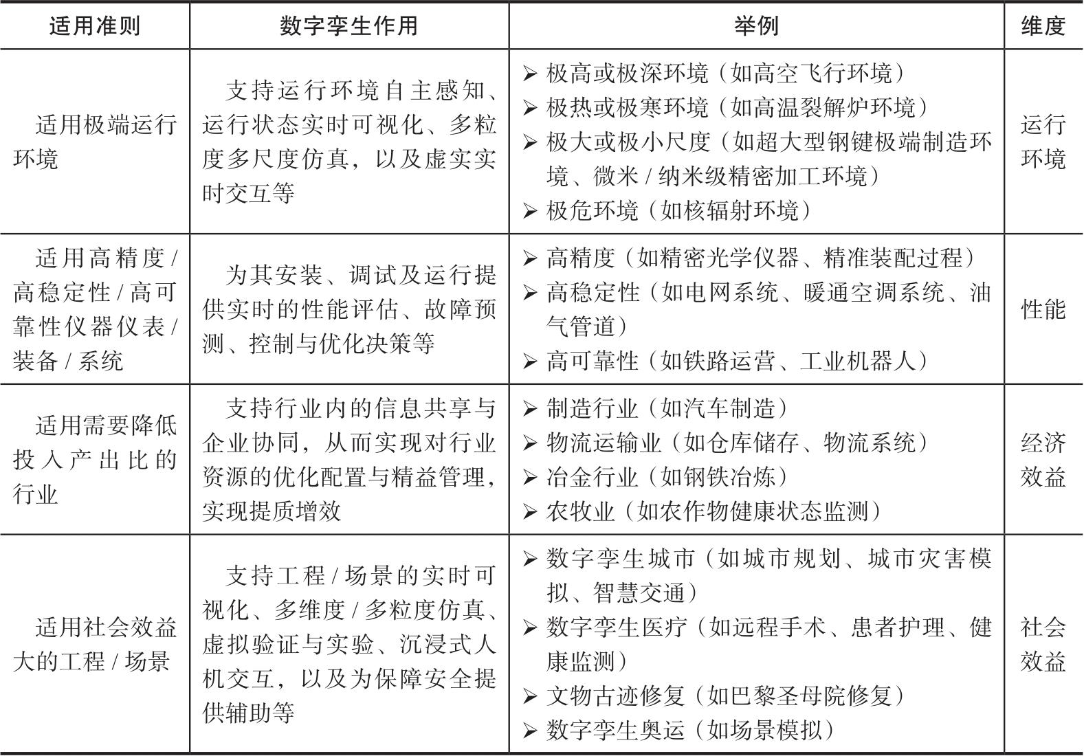企业在应用数字孪生前,面临的首要决策是:是否需要用数字孪生?是否适合用数字孪生?是否值得用数字孪生?事实上,数字孪生并非适用于所有对象和企业。为辅助企业根据自身情况做出正确决策,北京航空航天大学数字孪生团队尝试从产品类型、复杂程度、运行环境、性能、经济与社会效益等不同维度总结了数字孪生的适用准则以供参考,如表1-10所示。