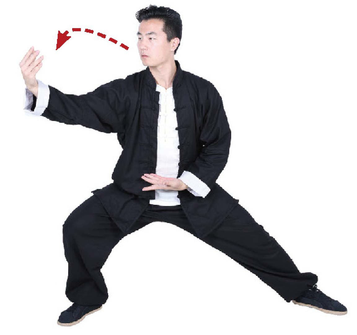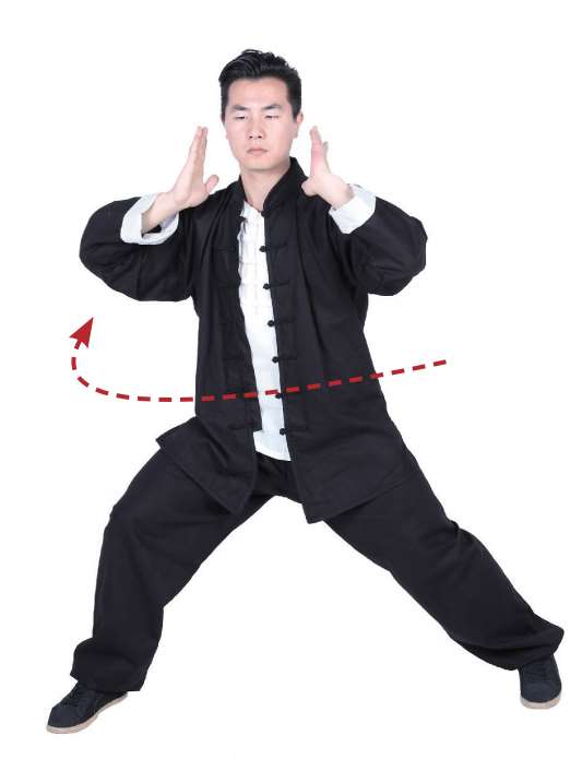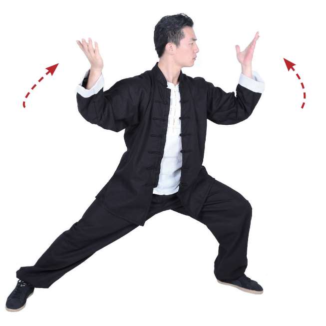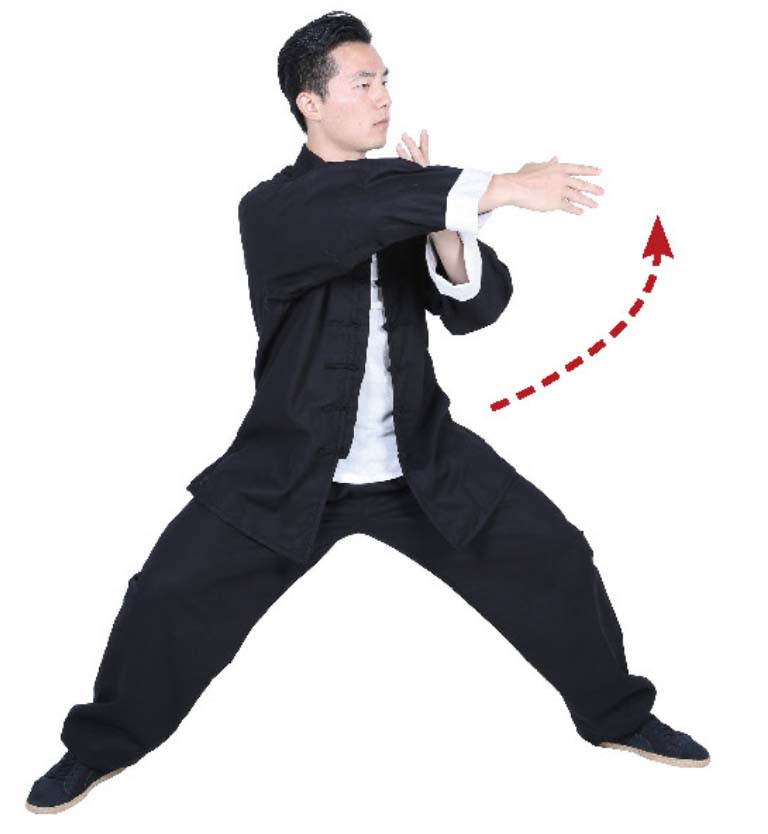 7 重心左移,双掌上提,向正前方画弧。