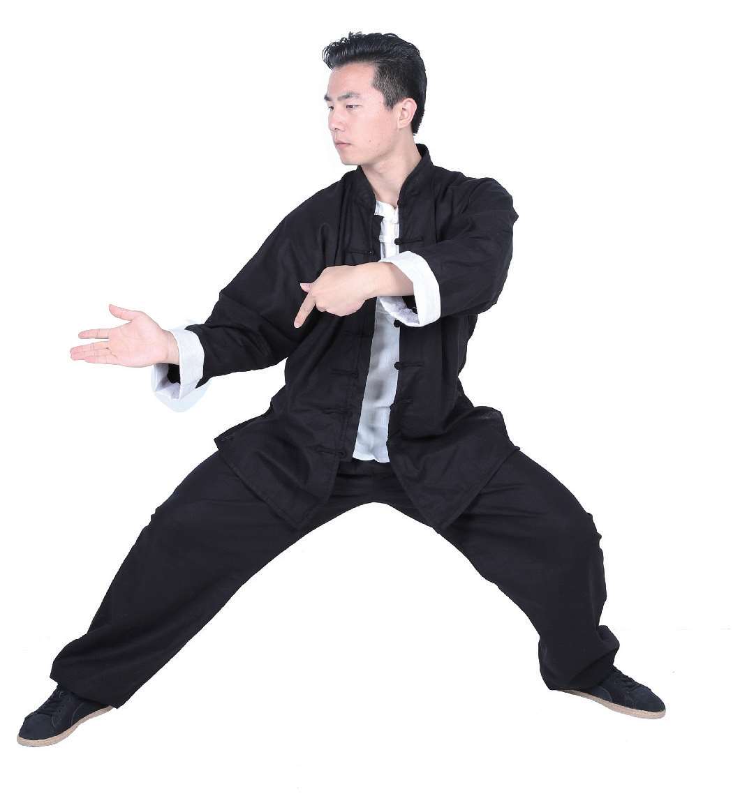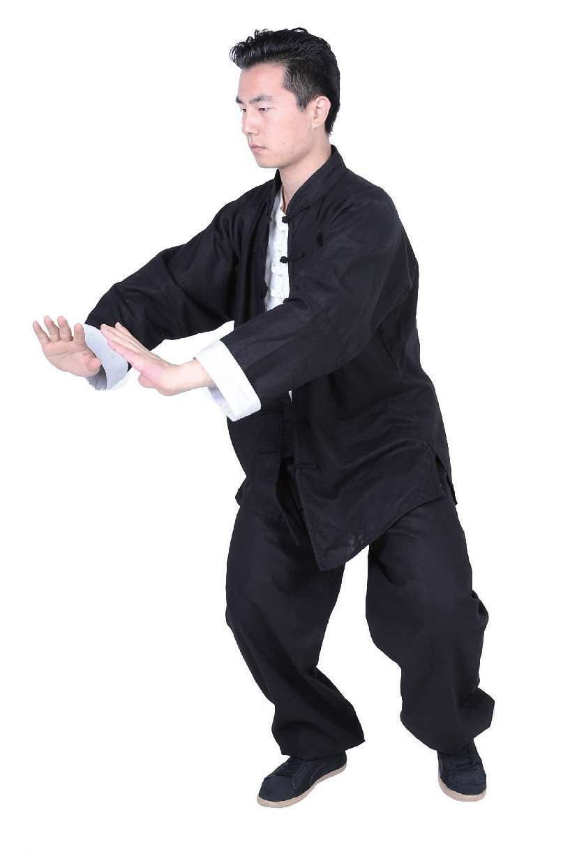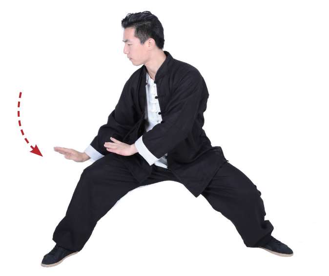 11 双掌保持掌心相对,然后向下按,直至肩前位置,身体则向右前方转。