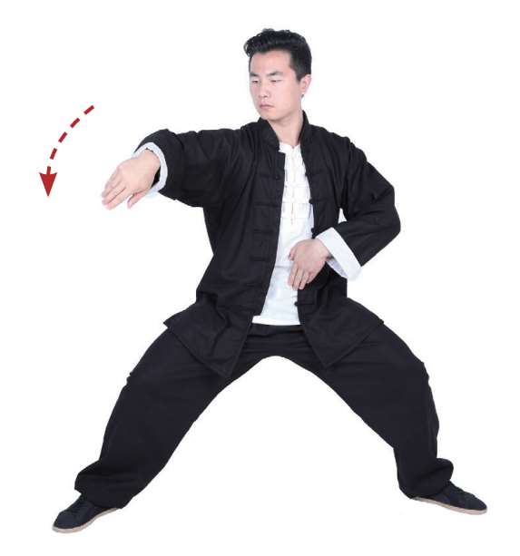 3 身体重心左移呈左弓步,右臂由右侧下落并向左前方画弧,左掌贴于右臂内侧。