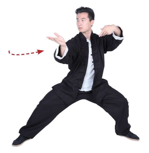 2 左掌向上翻,并放在腹部前方位置,右手掌心朝内,双腿呈右弓步。
