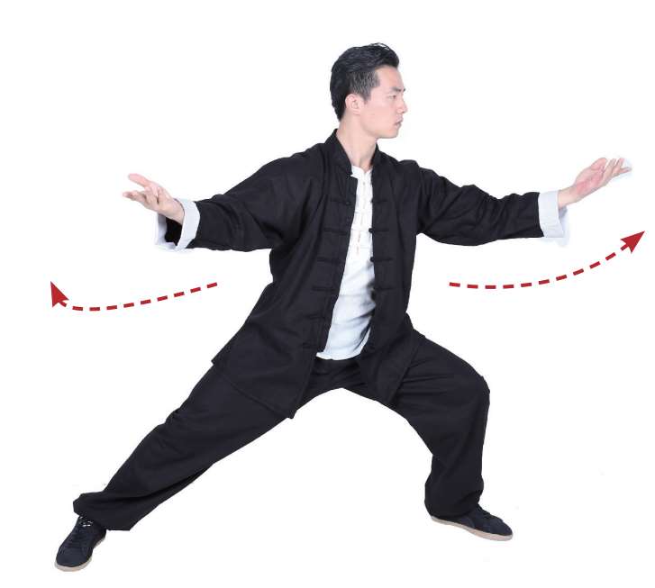 5 整体变为右弓步姿势,右掌向外翻,双臂从左侧向右侧画弧,掌心朝外。