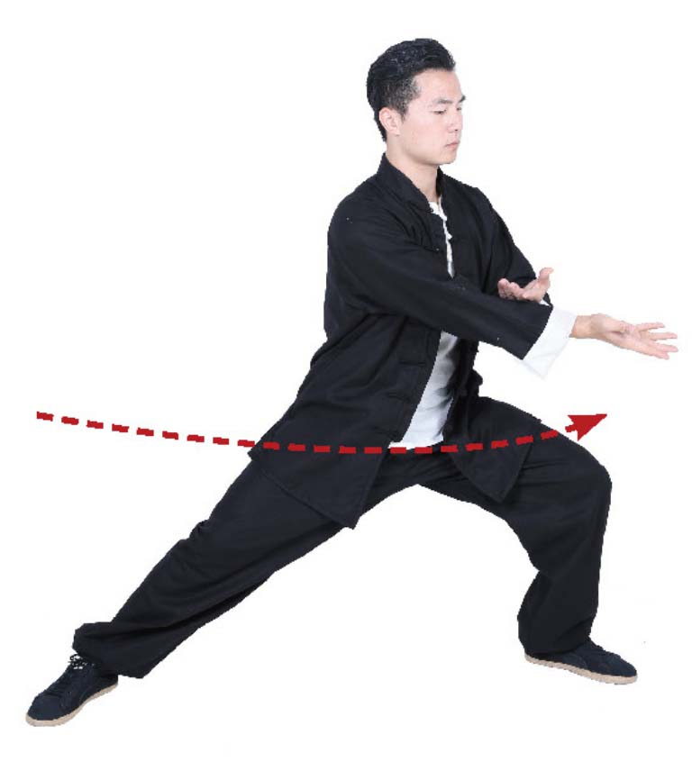 12 左脚向右脚的方向上一小步,脚尖着地,右腿微屈;双掌向前、向下推,掌心朝外。