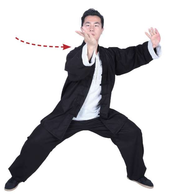 1 右钩手变掌,向左画弧,身体重心随之微微左移。