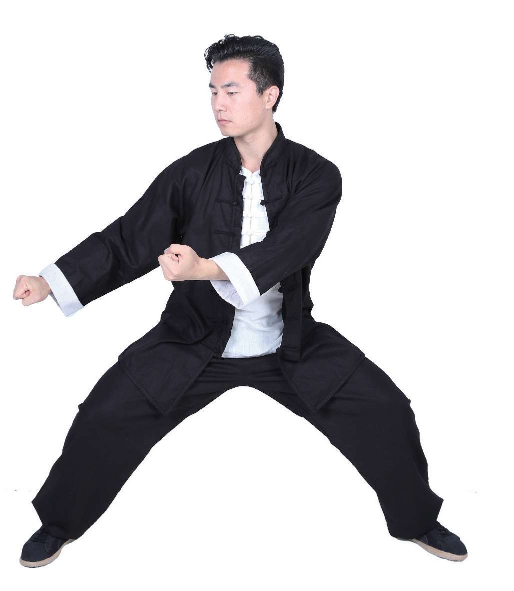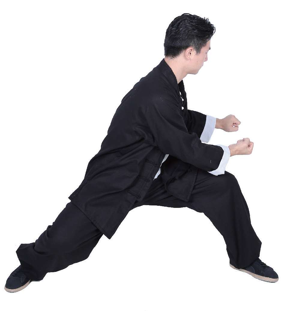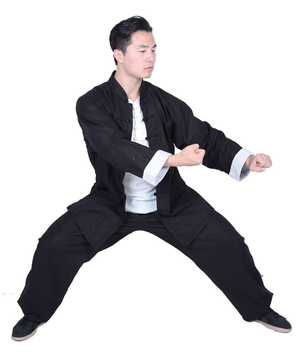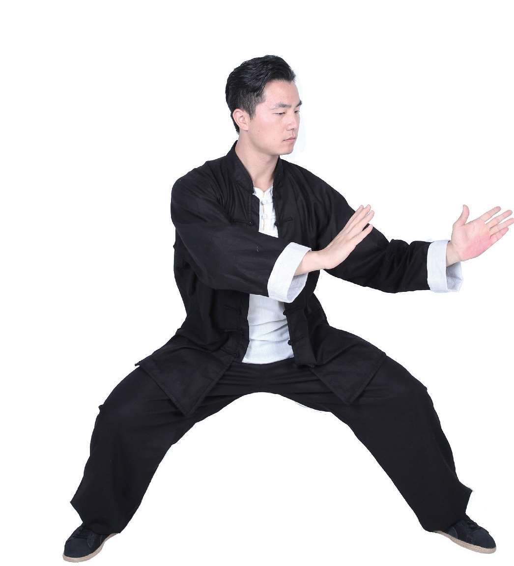 8 双拳微微上提至左肋前方,双腿保持屈膝,身体回正,眼睛看向拳头。