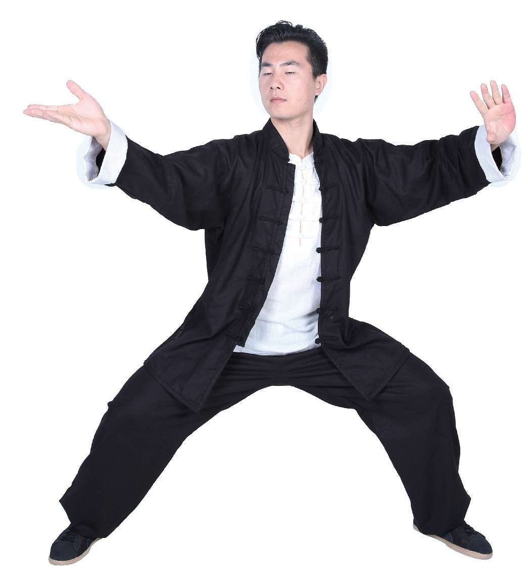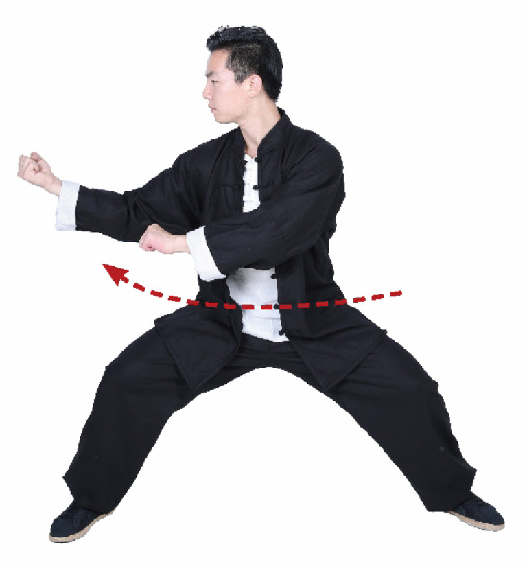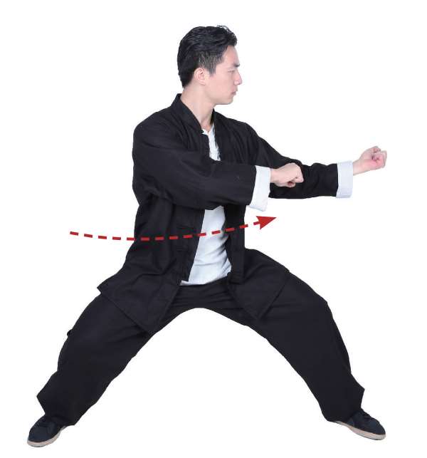 9 身体快速向右转,双拳向右侧移动,右拳拳心朝上,左拳拳心朝下。