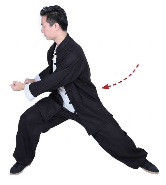 4 身体重心右移,呈右弓步,双掌向右肋前方画弧,然后由掌变拳。