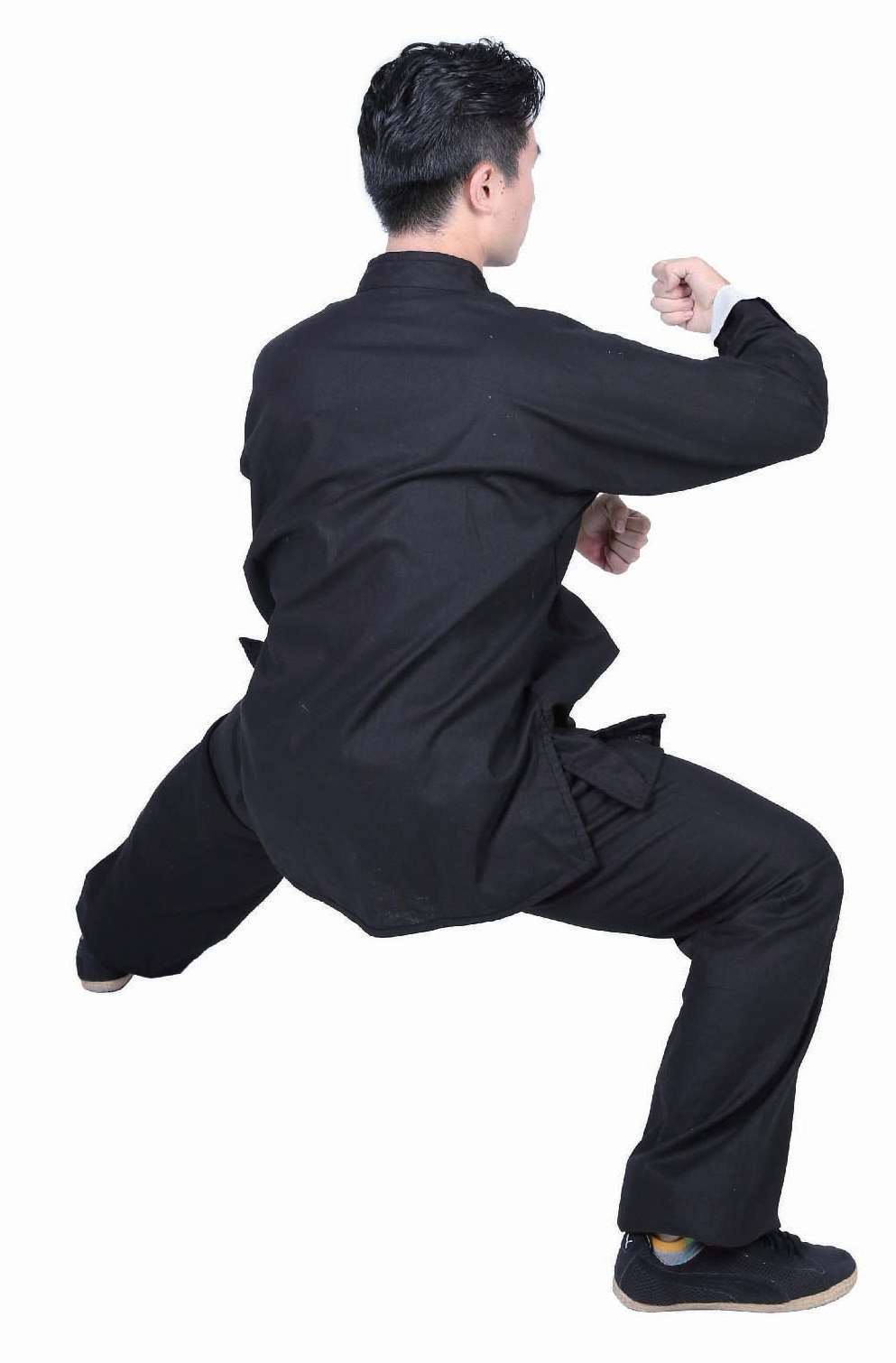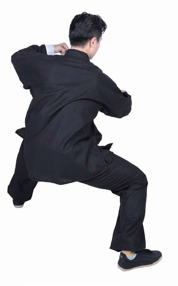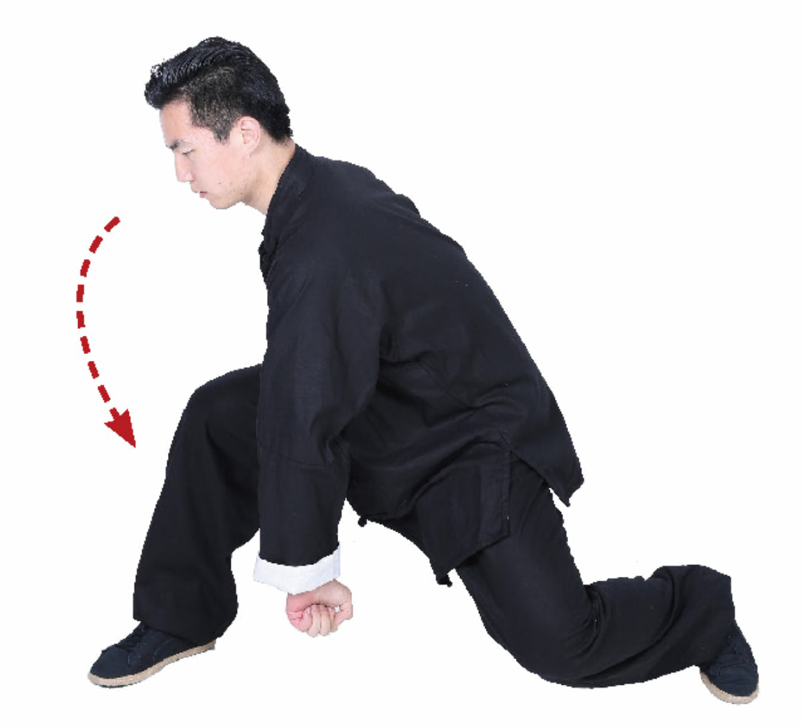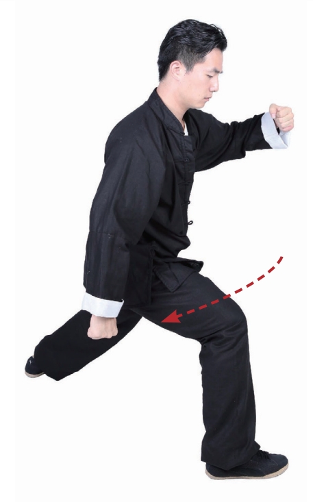 2 左拳向下运动至右腿左侧,右拳向下运动至右腿右侧,左腿屈膝向下。