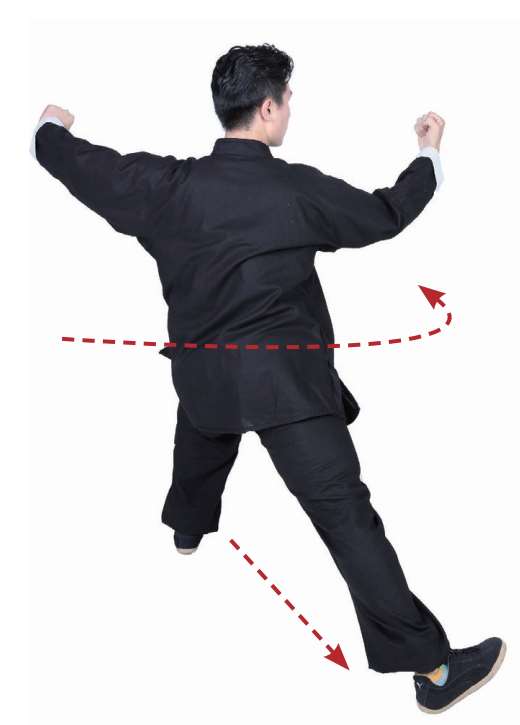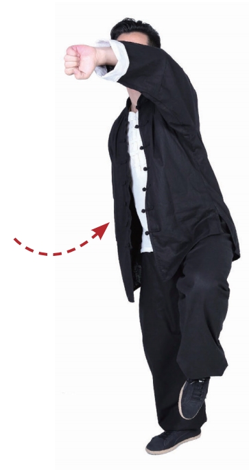3 右腿撑地,左腿上提,屈膝,脚尖朝下;同时左臂内旋提肘。接着身体向左转,右脚蹬地跃起(图中未展示)。