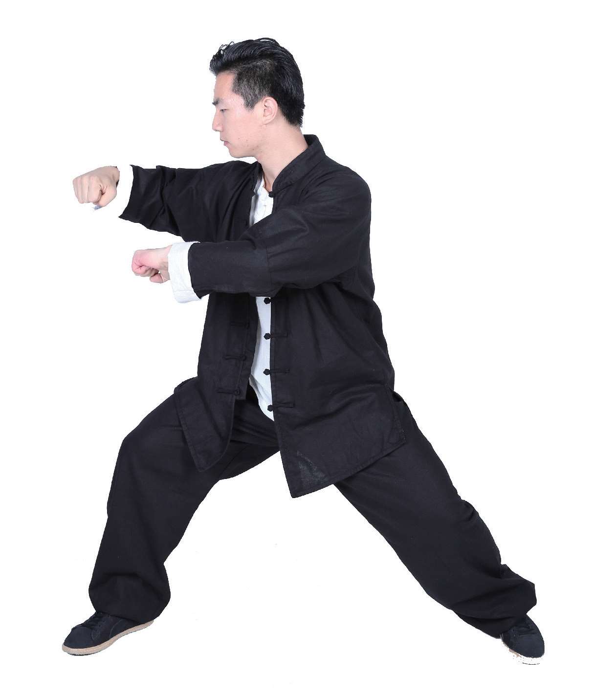 4 左腿、右腿一先一后在左前方落下,重心在左腿,左膝微微弯曲。身体向右转;同时左拳从额前位置先外旋,再经左侧腰部位置向左前方画弧,最终与肩齐高。