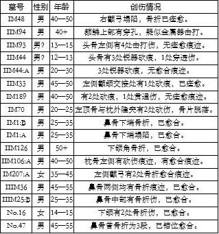 。洋海墓地考古发掘报告对489例个体进行研究,共发现17例颅骨创伤,占总数的3.5%。其中男性15例,女性2例。在17例伤痕中,脑颅部位7例,鼻部5例,颧弓3例,多为钝器伤,锐器伤较少