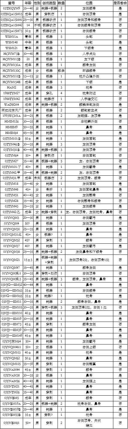 巴里坤东黑沟墓地93BYJHM6B,男性,45岁,额、枕部各有1处锐器伤,伤口穿透骨壁。额部伤位于额骨中部右侧,长约6厘米,前宽后窄,无愈合痕迹;枕部伤痕位于枕骨左侧中部,长约5厘米,前宽后窄,无愈合痕迹。93BYJHM6C,性别、年龄不详,头骨右侧眶处有砍伤,受力方向左侧下至右斜上,已愈合,属非致命伤。93BYJHM9,性别、年龄不详,额骨右眶上缘有一孔状贯通伤,颅内壁板障外翻,愈合痕迹明显。