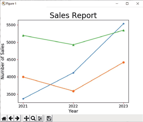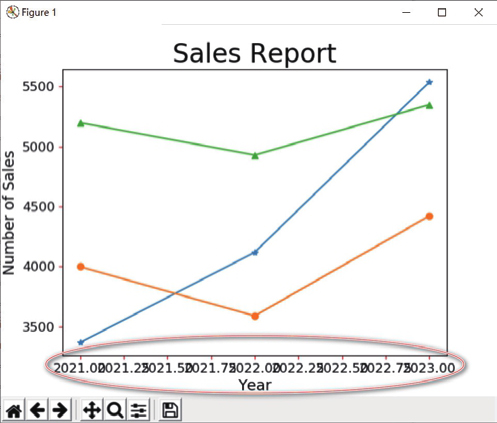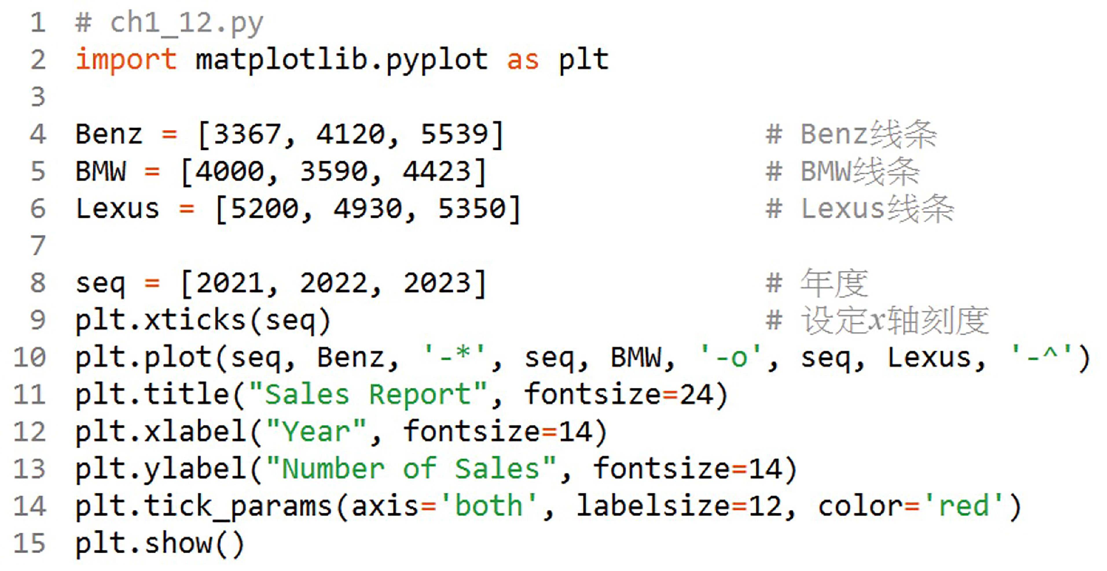 上述程序最大的遗憾是 x 轴的刻度,对我们而言,其实只要有2021、2022、2023这3个刻度即可,还好可以使用pyplot模块的xticks( )、yticks( )分别设定 x 、 y 轴刻度,可参考下列实例。