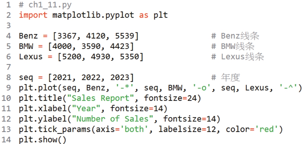 程序实例ch1_11.py: 假设3大品牌车辆2021—2023年的销售数据如下: