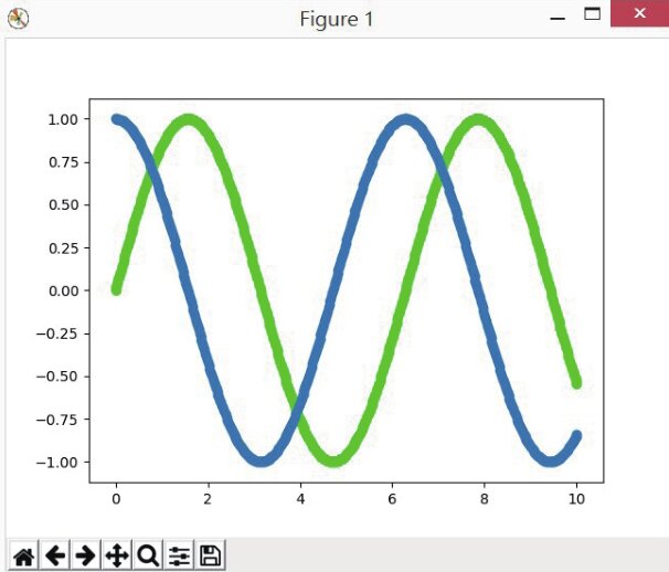 中学数学中我们有学过 sin( ) 和 cos( ) 概念,其实有了数组数据,我们可以很方便地绘制正弦和余弦的波形变化。单纯绘点可以使用scatter( )方法,此方法使用格式如下: