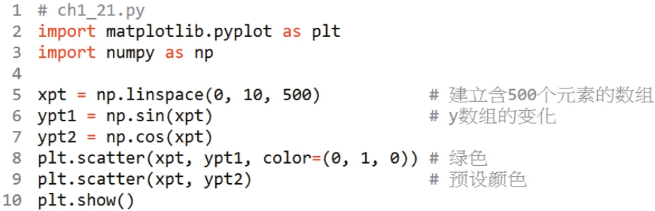程序实例ch1_21.py: 绘制sin( )和cos( )的波形,在这个实例中调用plt.scatter( )方法2次,相当于也可以绘制2次波形图表。