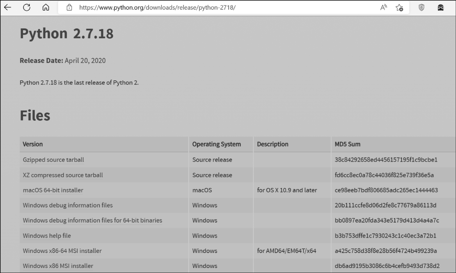 Python语言还有一个强大的团队在维护和更新这门语言,不断地推陈出新,对Python进行更新换代。Python自发布以来,主要有3个版本。第1个版本是1994年发布的Python 1.0版本,目前这个版本已经过时。第2个版本是2000年发布的Python 2.0版本,2020年4月20日这个版本更新到Python 2.7.18,这是Python官方发布的最后一个Python 2.0版本,如图1—1所示。