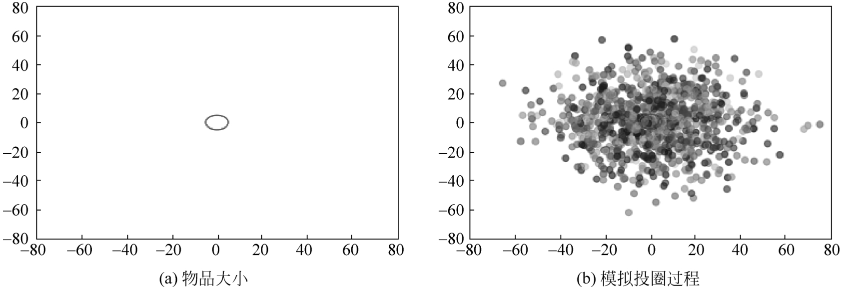 图2-9中红圈为物品,散点图为模拟1000次投圈过程中,投圈中心点的位置散布。