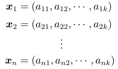 为了能够做到这样离散分类,需要对被分类的主体进行来自数据上的刻画。刻画一个主体,可以用一个实数来刻画,这个实数就是一个维度或者一个特征。用一个维度或者特征刻画主体太过简单。为了从更多侧面来描述主体,就需要提取更多特征。这样每个数据就是由这些特征组成的。每个数据都是下面的向量