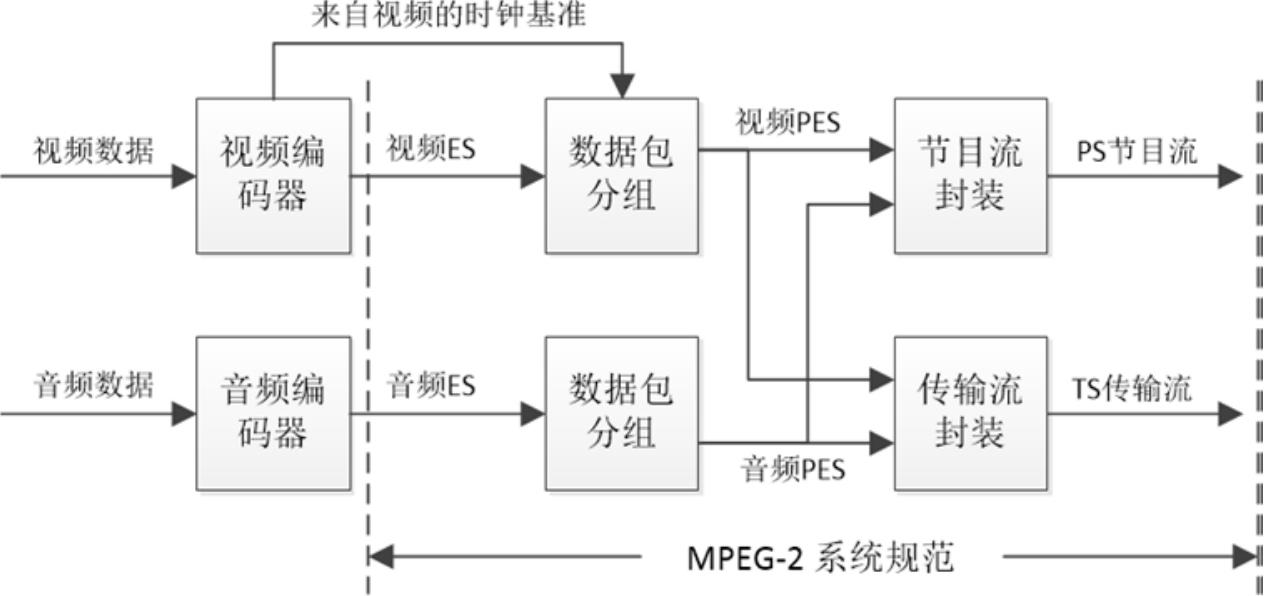 上面介绍的几种格式都是对音视频文件的封装,其实在MPEG-2第一部分还定义了系统规范,也就是音视频数据在网络上的流格式。存储在磁盘上的文件,其大小是固定的,播放时长也是不变的,但网络上的视频流却是持续不断的,比如说电视直播,一开始怎么知道它什么时候结束呢?只要网络没断,那么直播视频一直在放。MPEG-2的第一部分就描述了如何将视频流与音频流合成为节目码流和传输码流,其中MPEG2-PS(Program Stream,节目流)用于存储具有固定时长的节目,比如DVD电影;MPEG2-TS(Transport Stream,传输流)用于需要实时传送的节目,比如电视节目。MPEG-2的系统规范如图2-1所示。
