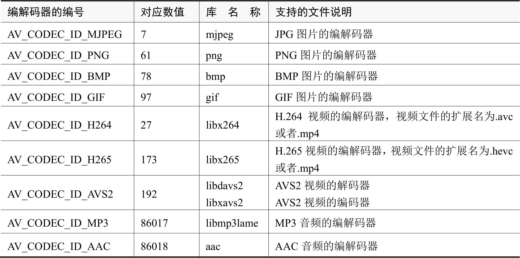 AVCodec定义了编解码器的详细规格,使用该结构需要包含头文件libavcodec/avcodec.h,调用avcodec_find_encoder函数会获得指定编号的编解码器,也可以调用avcodec_find_encoder_by_name函数获得指定名称的编解码器。常见的编解码器与文件类型的对应关系见表2-1。