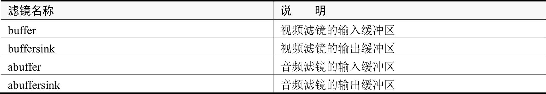 AVFilter定义了滤镜的规格,调用avfilter_get_by_name函数会获得指定名称的输入滤镜或者输出滤镜,滤镜名称的对应说明见表2-4。