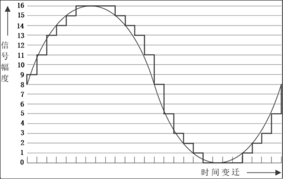 音频采样指的是在某个时刻测量模拟信号得到的声音样本。真实声音虽然是连续的,但是在计算机看来,声音是离散且均匀的音频样本,离散样本需要经过数字转换才能存储为样本数据。对模拟信号进行数字采样的数值转换如图2-5所示。其中细的曲线为原始的模拟信号,粗的折线为采样后的数字信号。