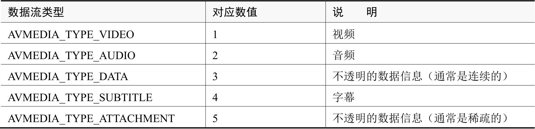 “流”指的是一个连续的管道,类似于轨道、河道,所有同类型的数据都要按照时间先后顺序放在同一个“流”里面。FFmpeg支持音频流、视频流、字幕流等类型,其中音频流和视频流比较常用,大多数视频文件也只包含这两种数据流。FFmpeg支持的数据流类型见表2-2。