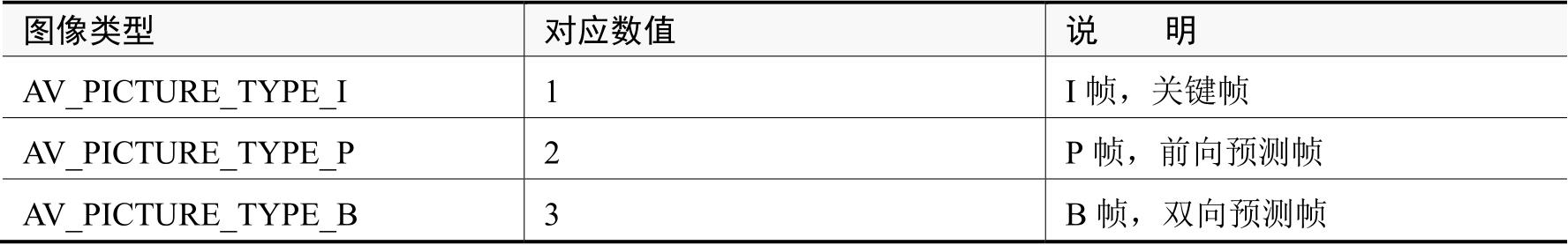 视频帧的图像类型保存在AVFrame的pict_type字段,常见的图像类型说明见表2-3。