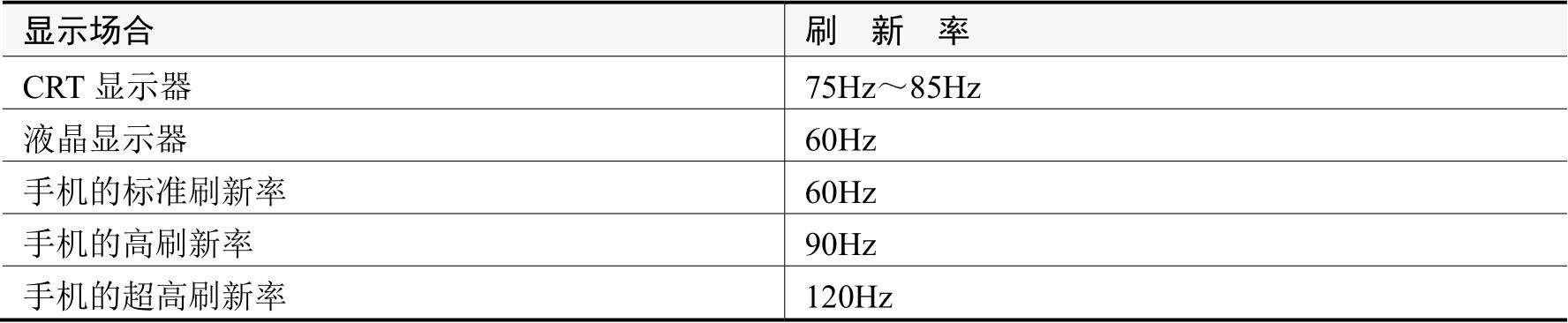 与帧率含义相似的另一个概念是刷新率。它们的区别在于:帧率是针对传输的,表达的是每秒传输的帧数,其单位是fps;刷新率是针对显示的,表达的是每秒的刷新次数,其单位是Hz(赫兹)。刷新率越高,显示的图像画面就越稳定,越不容易闪烁。常见的显示场合及其对应刷新率的关系说明见表3-2。