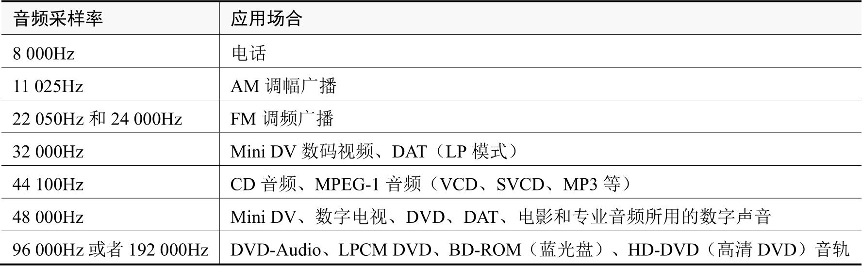 采样率多用于音频,也称采样频率、采样速度,指的是单位时间内从连续信号采集离散样本的次数,它的单位名称是Hz。采样率越大,采集到的音频信号就越连贯,也越清晰。常见的音频采样率及其应用场合对照关系见表3-3。