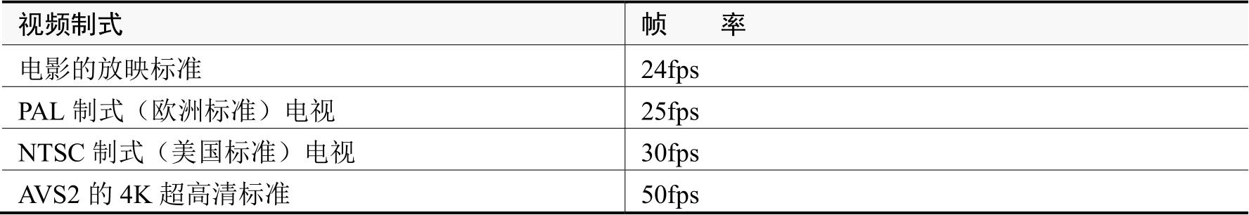 帧率专用于视频,指的是视频帧连续显示的频率,也就是每秒会展现多少幅视频画面,它的单位是fps(帧每秒,全称frames per second,每秒传输的帧数)。比如电影放映的标准是每秒24帧,那么该电影的帧率就是24fps。帧率越高,人眼感知的视频画面就越流畅。常见的视频制式及其对应帧率的关系说明见表3-1。