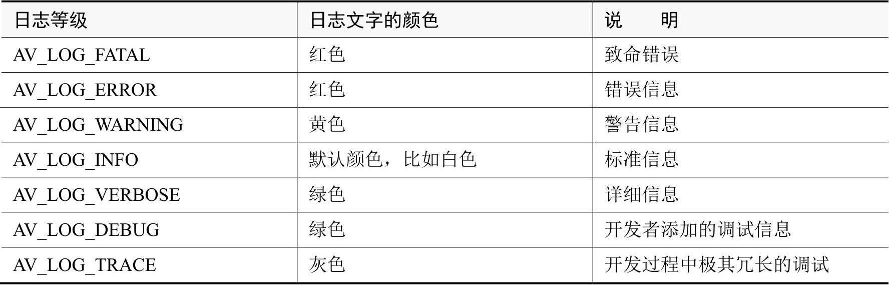 注意,前面调用av_log函数时,第二个参数都填作AV_LOG_INFO,该参数值表示标准信息,用于标明当前日志的日志等级,详细的日志等级说明见表1-4。