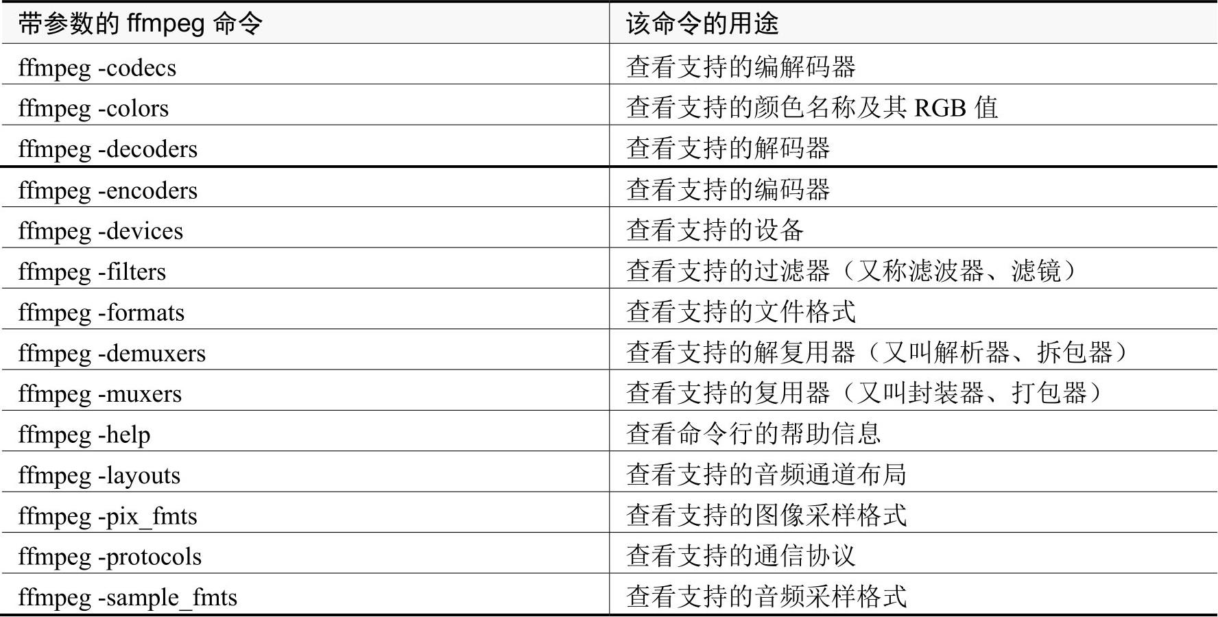 ffmpeg程序还能够查看更多信息,详见表1-3。由于相关概念比较专业,因此这里不再一一展开,等到后续涉及时再来讲解。