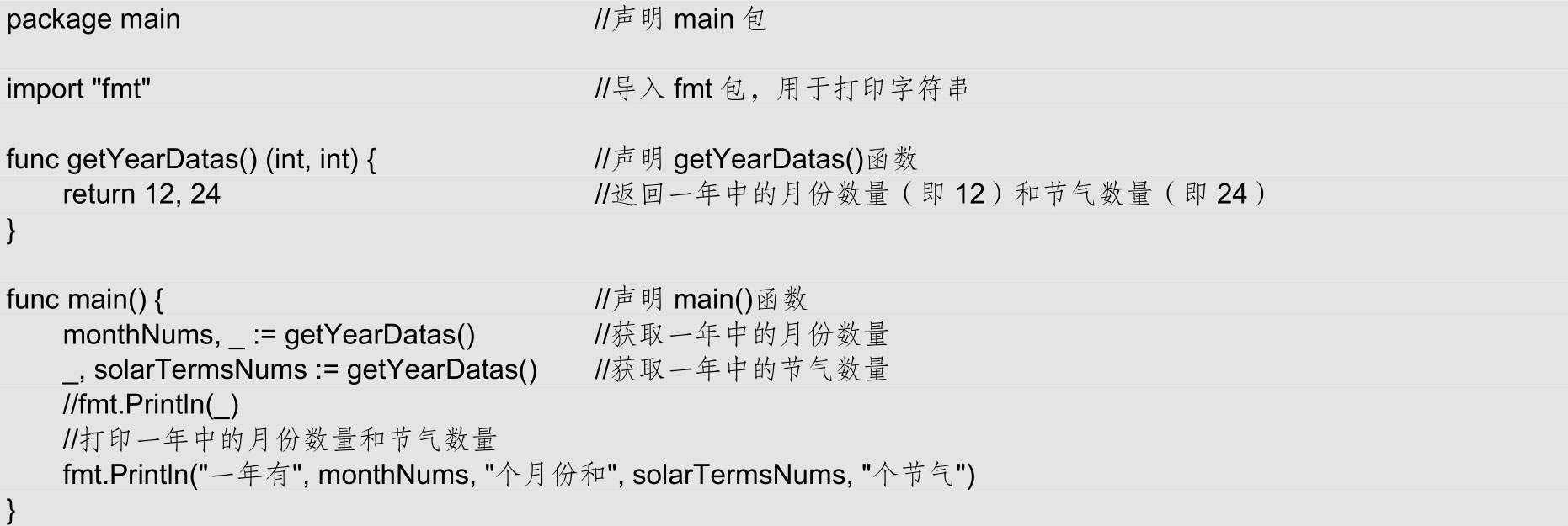 首先使用func关键字声明用于返回一年中的月份和节气数量的getYearDatas()函数,然后在main()函数中使用匿名变量和“短变量声明”的语法格式分别获取一年中的月份和节气。代码如下。