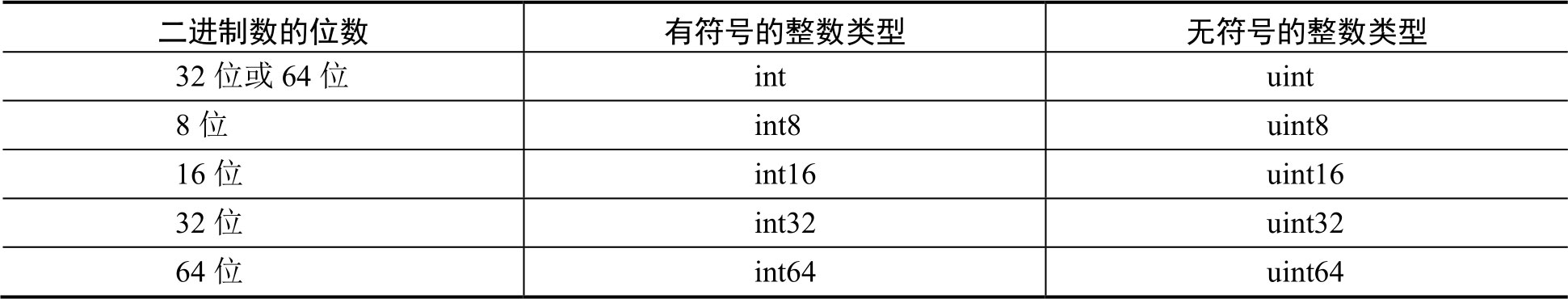 在Go语言中,整数类型包含4个有符号的整数类型和4个无符号的整数类型。其中,二进制数的位数与整数类型的对应关系如表3.1所示。