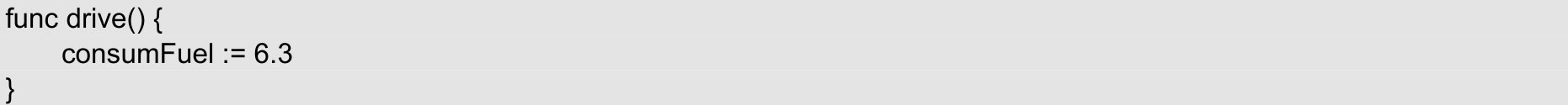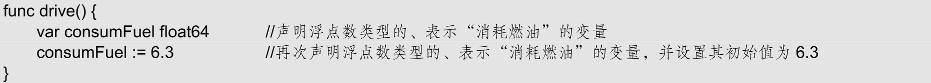 例如,使用func关键字声明一个表示驾驶汽车的drive()函数;在drive()函数中,使用“短变量声明”的语法格式表示“当前车辆每百公里消耗汽油6.3L”。代码如下。