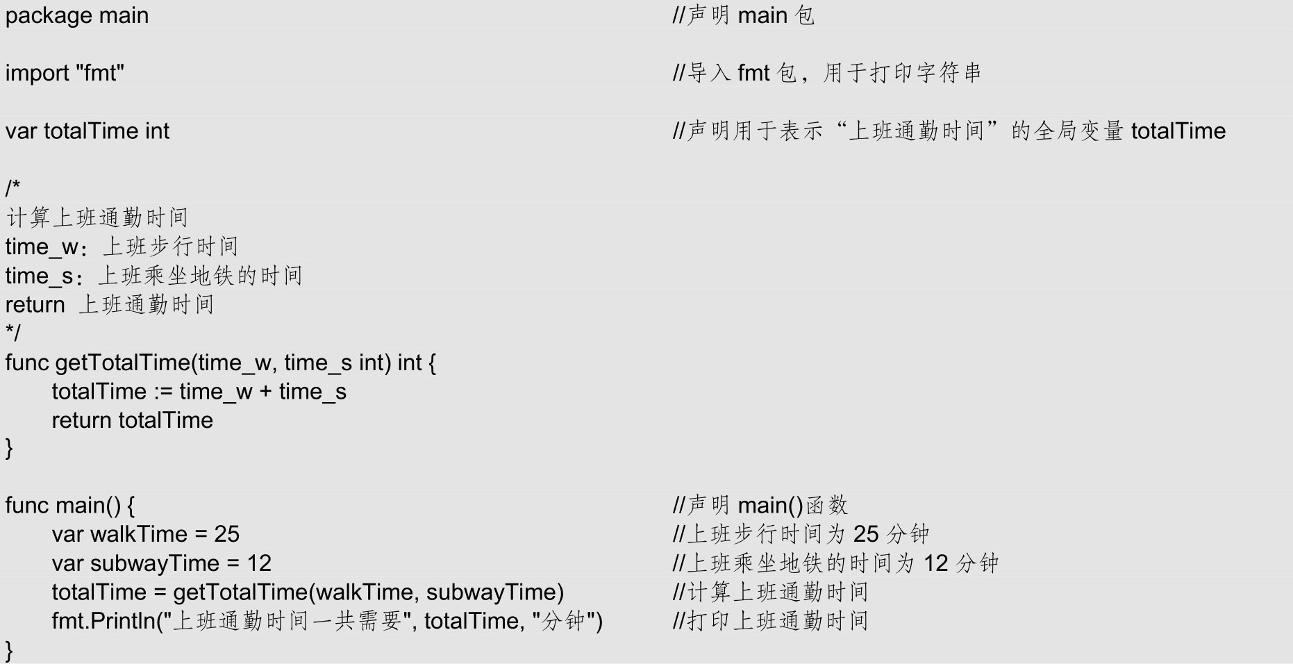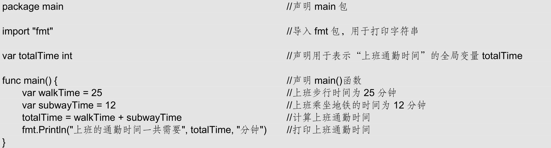 首先使用var关键字声明用于表示“上班通勤时间”的全局变量totalTime,然后分别在main()函数中声明并初始化用于表示“上班步行时间”的变量walkTime和表示“上班乘坐地铁的时间”的变量subwayTime,最后计算并打印上班通勤时间。代码如下。