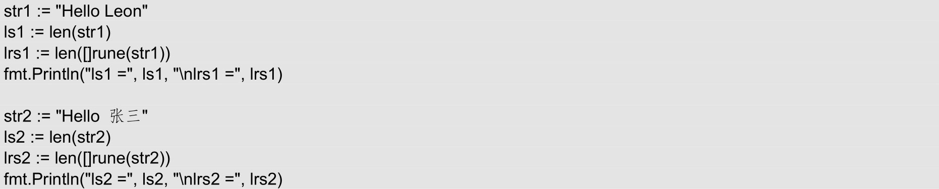 例如,分别使用len(str)和len([]rune(str))依次获取字符串“Hello Leon”和“Hello张三”的长度。示例代码如下。