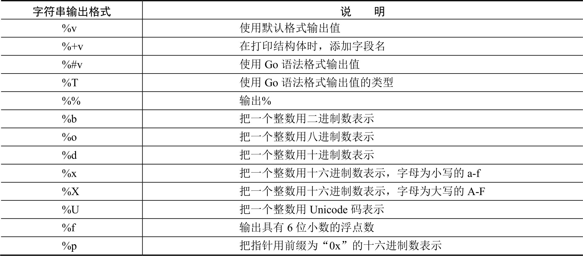在Go语言中,常用的字符串输出格式及其说明如表3.3所示。