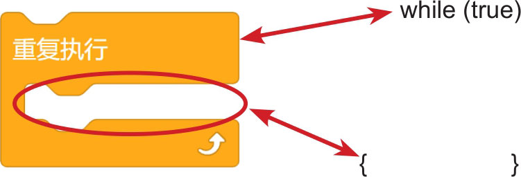 while (true){ } 相当于 重复执行 积木块, while(true) 代表重复执行, { } 如同积木块的大嘴巴,被装进去的程序语句会重复执行。