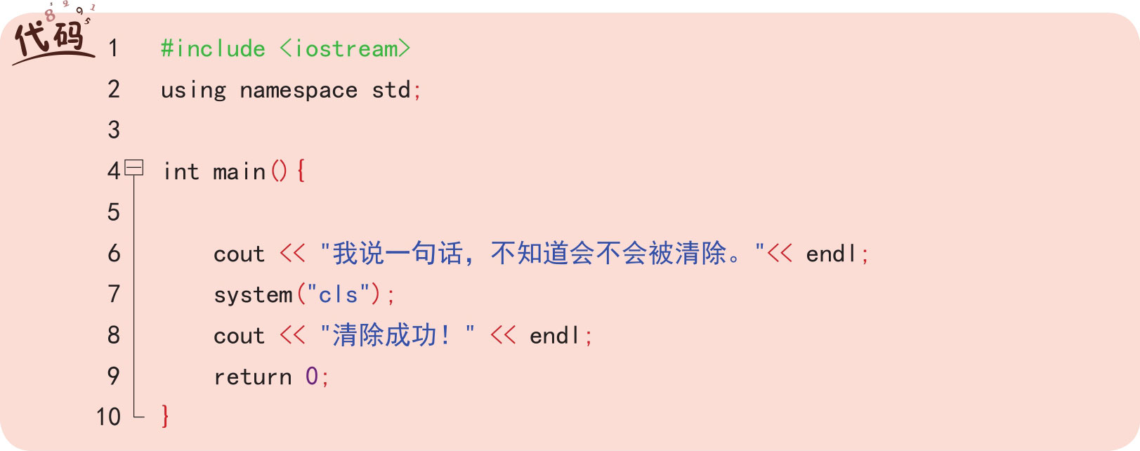 在这个程序中, system("cls") 清除屏幕的效果似乎并不明显。结合学到的知识,将这个函数剥离出来,单独编写一个程序来体验一下它的效果。