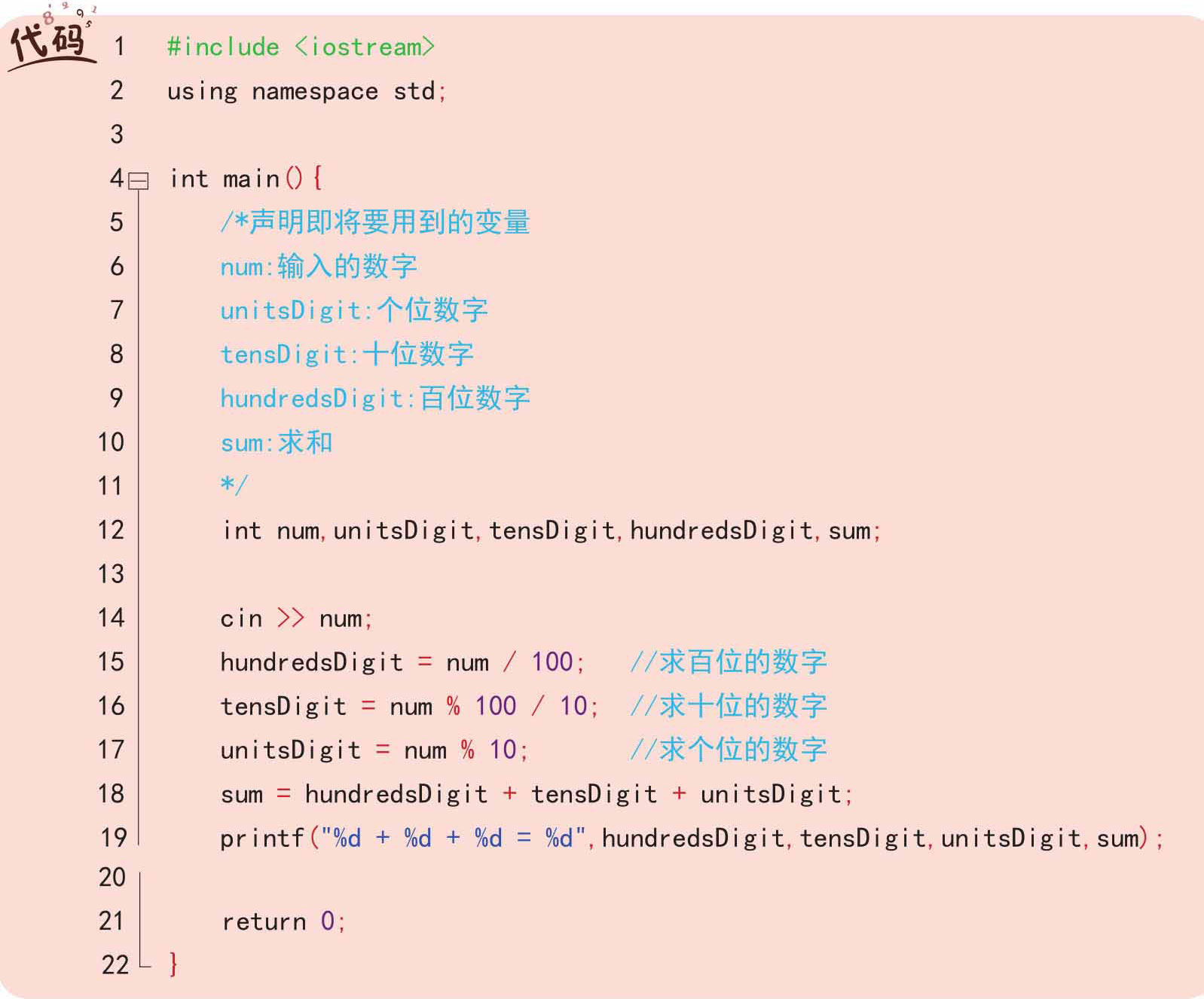printf("%d + %d + %d = %d",hundredsDigit,tensDigit,unitsDigit,sum) ,重点研究一下这行代码。