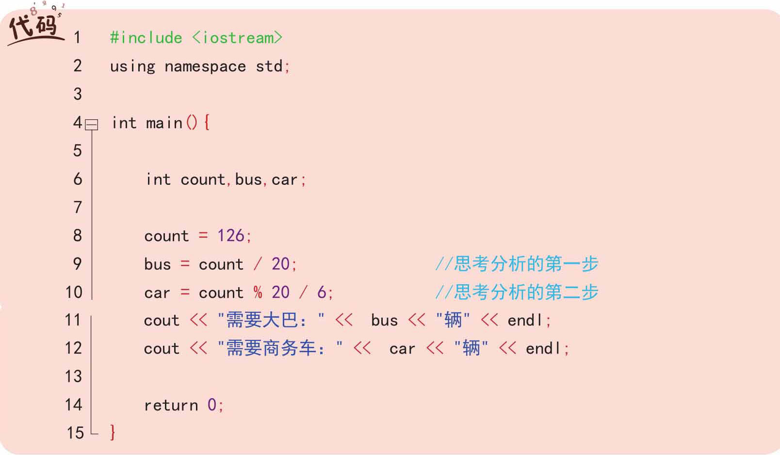 这里只是将思考逻辑转换成了程序语言,在实际安排车辆时,需要考虑商务车数量无法整除的情况,此时需向上取整,多安排1辆。