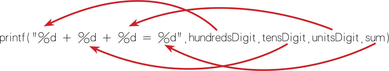 printf("%d + %d + %d = %d",hundredsDigit,tensDigit,unitsDigit,sum) 讲究参数依次对应,第一个%d对应后面第一个参数。