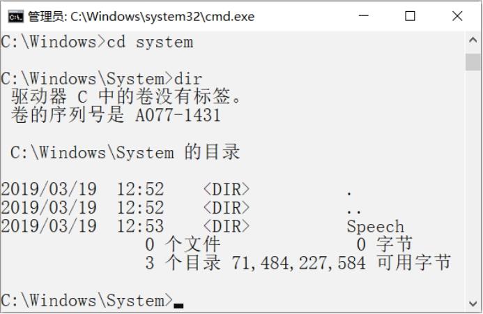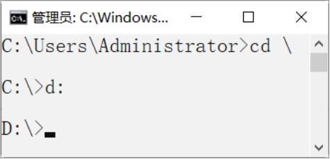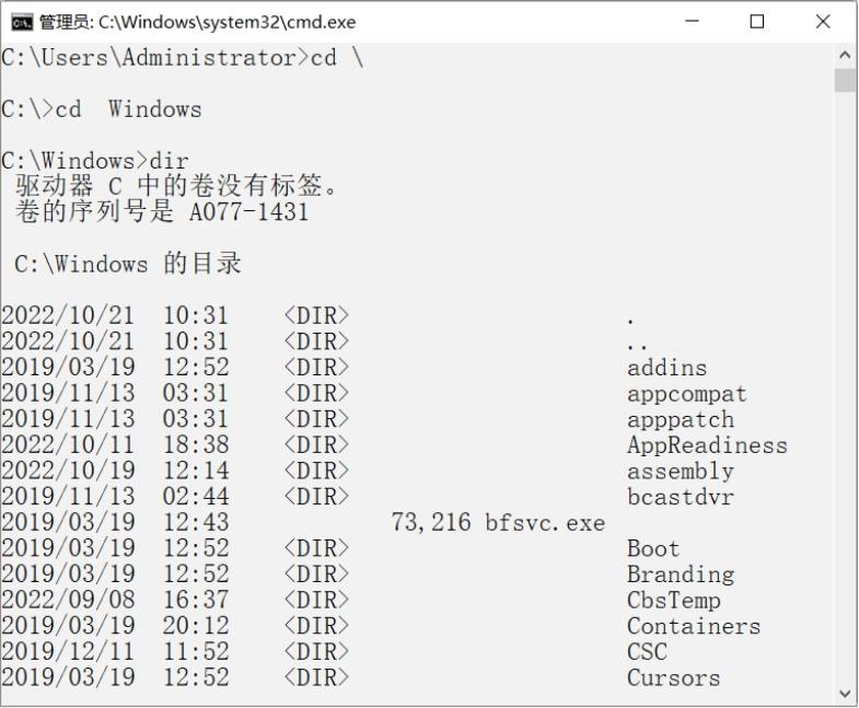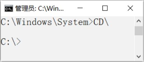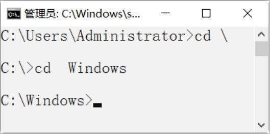 如果要更改当前目录,那么可以用cd命令,例如输入“cd \”,则进入C盘,再输入cd Windows,则目录为Windows目录,按Enter键后,提示符变成了C:\Windows,这就表示当前目录变成了C盘的Windows目录,如图2-17所示。